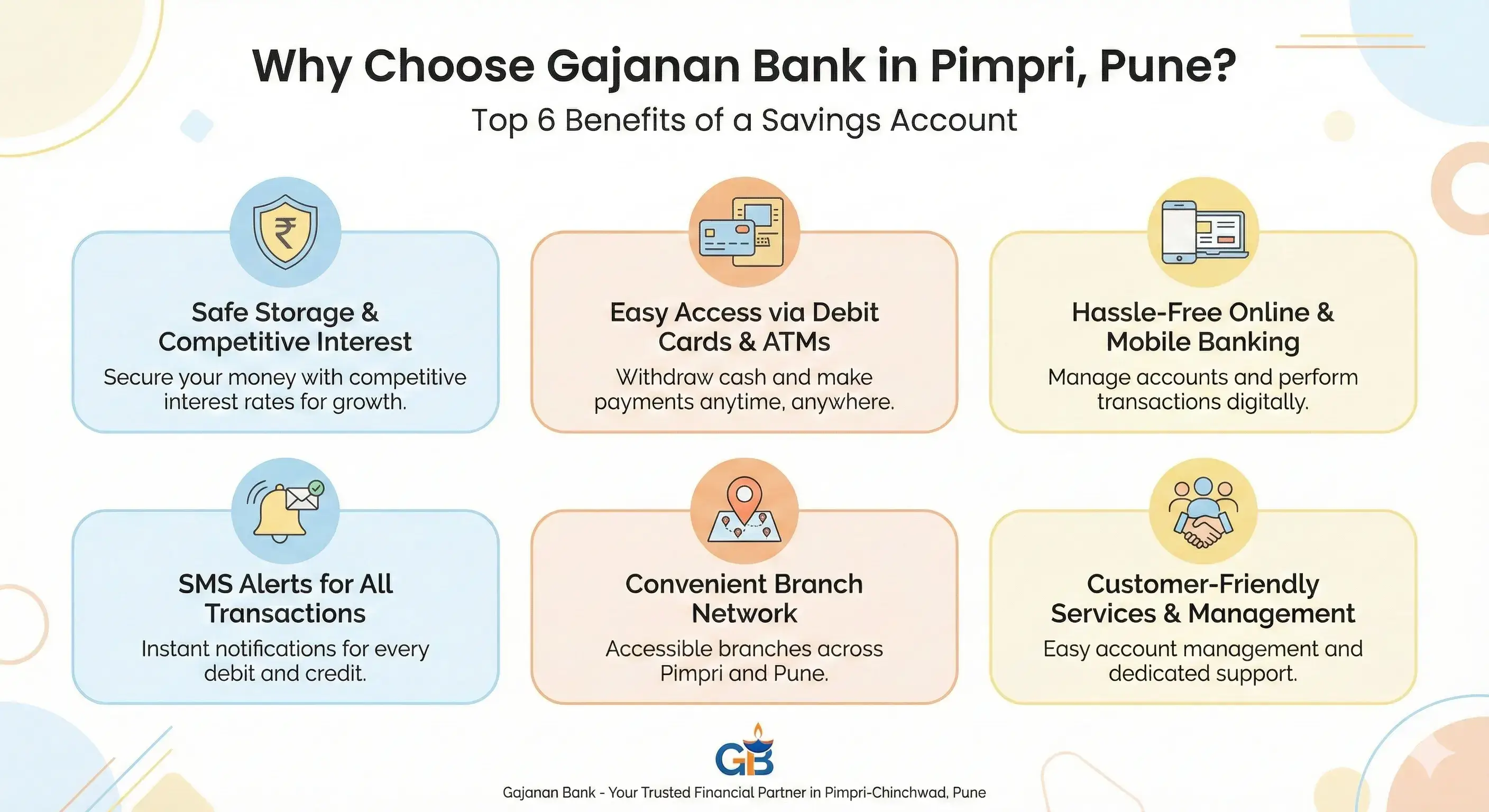 There are many banks in Pune, but Gajanan Bank stands out for its customer-friendly services and easy account management. Some key advantages of opening a savings account here include: